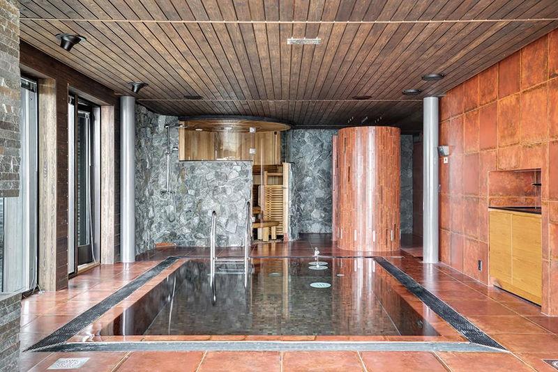 フィンランド文化においてサウナは欠かせない存在であり、国連教育科学文化機関(UNESCO)の「無形文化遺産」にも登録されています。フィンランド北部のルカトゥントゥリにある印象的なモダン邸宅には、2つのサウナが備わっています。ひとつは円形のスパスタイルで、テラコッタタイルのプールや暖炉付きのリラクゼーションエリアに隣接。もうひとつは屋外にあり、床から天井までの大きな窓から広がる絶景を楽しめる伝統的な薪焚きサウナで、まさに本場の北欧体験を堪能できます。雪をかぶった松林を背景に、テラスには薪焚きのホットタブも備えられています。