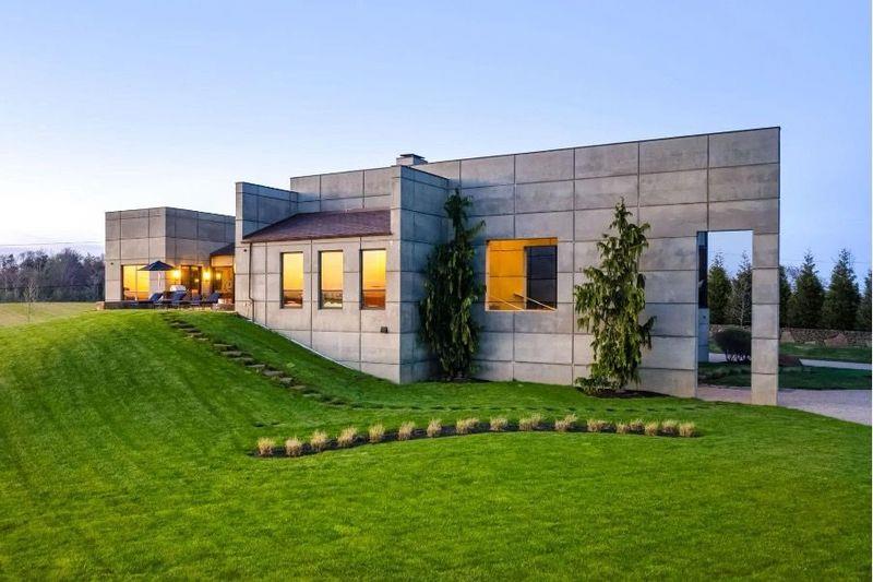 一方、対照的なのが2016年に完成したロードアイランド州の邸宅Brutaliste Sur Mer〉です。遠景からの印象を意識して設計され、コンクリートの平面がルービックキューブのように組み合わさった外観は、まさに“コースタル・ブルータリズム”の象徴。そのインテリアはチーク材の壁や、木材で仕上げたドレッシングルーム、6席のホームシアターなどオーダーメイドのディテールで温かみを加えています。高台に位置するため、サコネット海峡を一望できる比類なき眺望も魅力です。