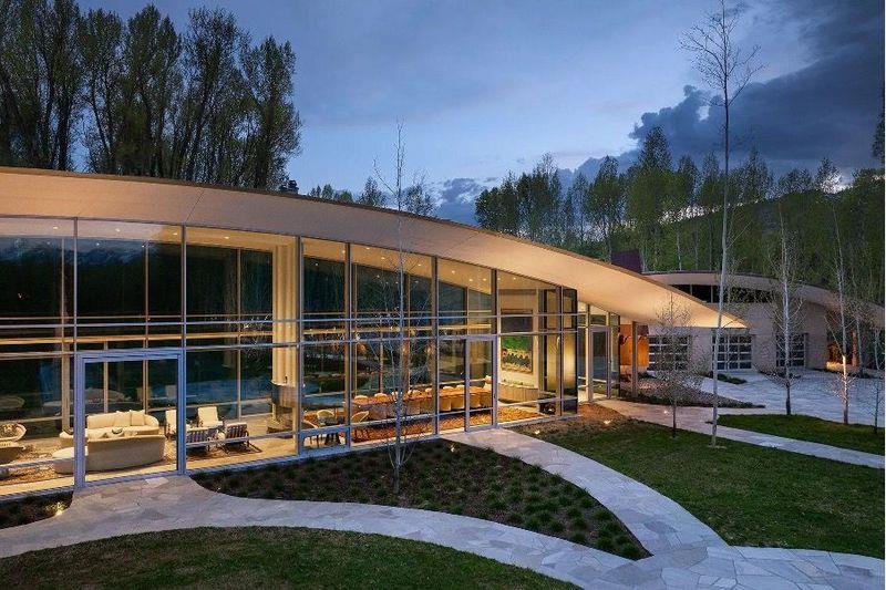 ワイオミング州にある建築家ウォレス・カニンガム設計の〈ザ・リバーハウス〉は、川や小川の景観に溶け込むように低く佇む邸宅です。2023年に完成したこの建物は、外観だけ見ると浅くアーチを描く屋根と床から天井までの大きなガラス壁が特徴で、まるでパブリック・アート・ギャラリーのよう。しかし内部には石造りの暖炉や木材の造作が配され、豊かな自然光と周囲の景観を取り込む心地よい空間が広がっています。